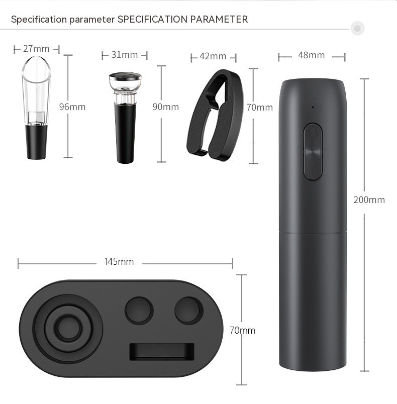 Bottle opener *1, vacuum stopper *1, wine pourer *1, tin foil cutter *1,Storage base *1, USB charging cable *1, instruction manual *1, English color box *1